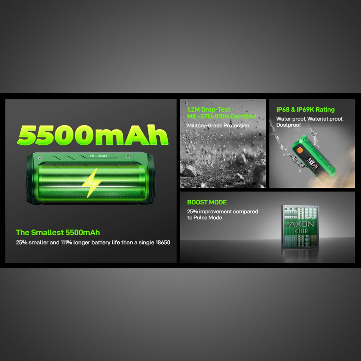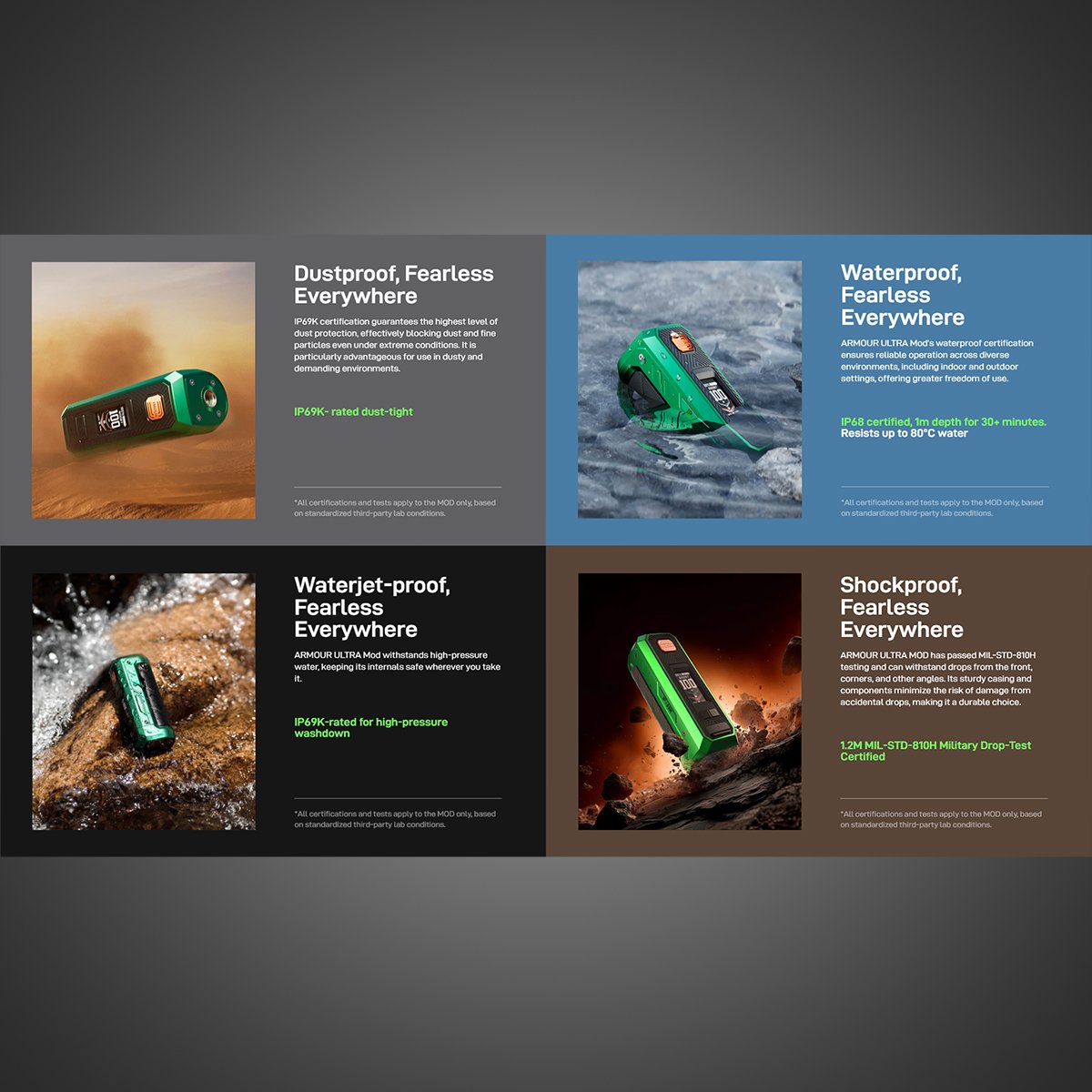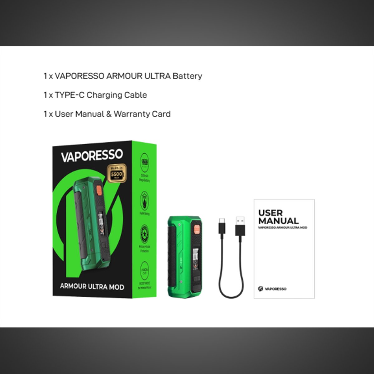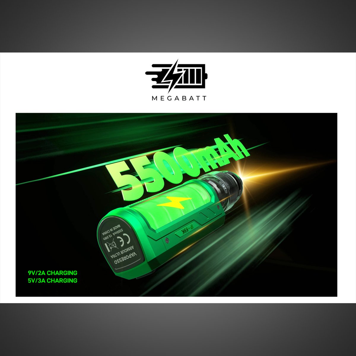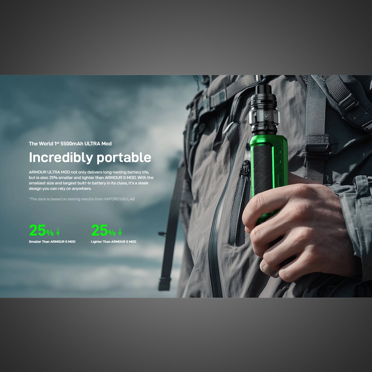 La Box Armour ULTRA de VAPORESSO combine une batterie intégrée de 5 500 mAh et une puissance maximale de 100 W dans un format compact et ultra-résistant (certificats IP68/ IP69K / MIL-STD-810H) — parfaite pour une utilisation intensive et nomade.