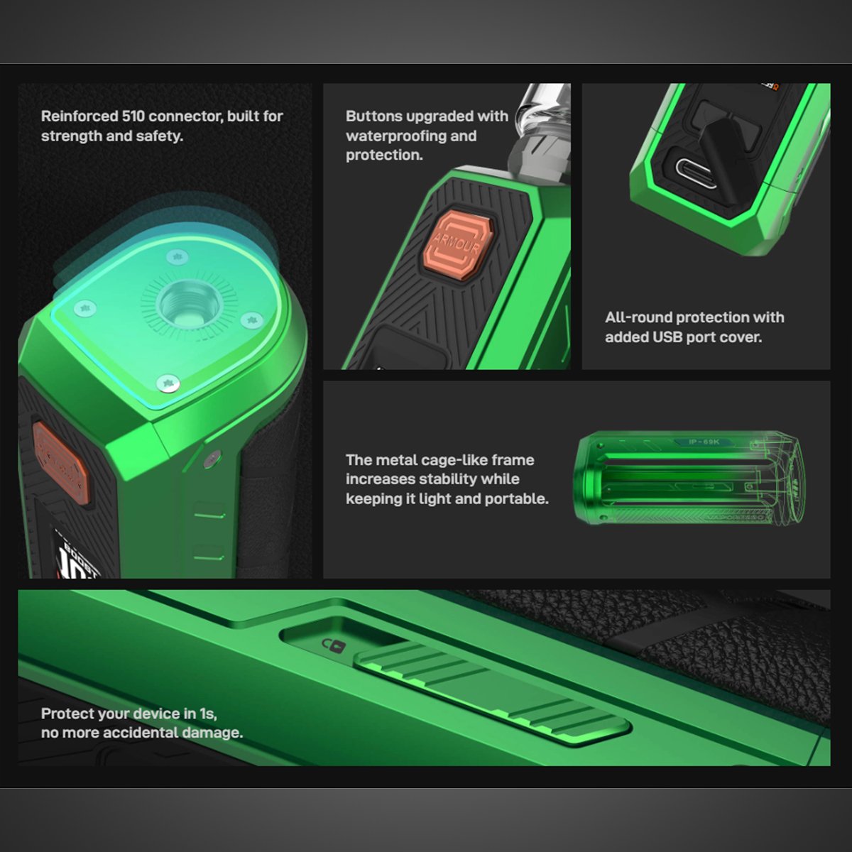 La Box Armour ULTRA intègre le chipset AXON offrant plusieurs modes de fonctionnement (VW, Boost, Eco, Smart, TC Ni/Ti/SS) pour s’adapter à tous les profils de vapoteurs. Grâce à sa batterie de 5 500 mAh, elle revendique une autonomie équivalente à deux accus 18650, tout en adoptant un gabarit réduit.